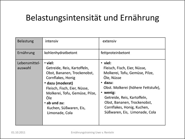 Sie ist für den Leistungsfortschritt sowie das Tempo und die Tiefe  der Regenerationsprozesse Voraussetzung. Dabei werden die gesättigten, ungesättigten und Omega-3-Fettsäuren und die Rolle der Eiweiße zu oft unterschätzt. Eine Leistungsoptimierung erfolgt, wenn die Energiedepots der Muskulatur für das bevorstehende Training gut gefüllt sind. Aber erst eine optimale Kombination der zugeführten „Kalorien ohne Mängel", also mit Vitaminen, Mineralstoffen, Spurenelementen und ausreichend Wasser – gewährleistet im Endeffekt bestmögliche Stoffwechselvorgänge und eine hochwirksame Belastungsverarbeitung. Bei intensiver Belastung soll die Ernährung kohlenhydratbetont, bei extensiver Belastung fettproteinbetont sein.