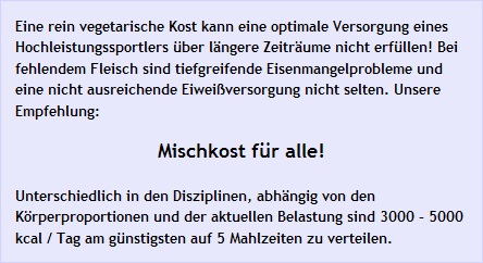 Viele verschwenden Geld obwohl sie mit 5 „Mahlzeiten" und einer ausgewogenen Mischkost am besten beraten wären. Sie berücksichtigen oft zu wenig, dass der zuzuführende Nährstoffanteil an Fetten, Eiweißen und Kohlenhydraten von der absolvierten Belastung bestimmt wird und Extreme auch für Läufer in Richtung Kohlenhydratoverloading oder Vegetarier vermieden werden sollten. Moderne Leistungssporternährung zielt auf eine möglichst optimale Balance in der Energieversorgung.