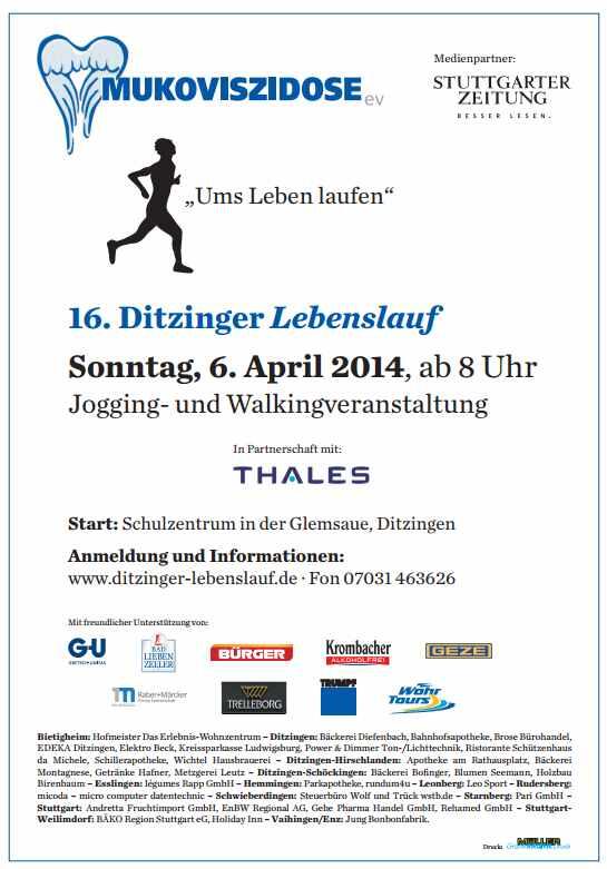 16. Ditzinger Lebenslauf – Das Original – Mukoviszidose besiegen – Sonntag, 6. April 2014 – Um’s Leben laufen“!