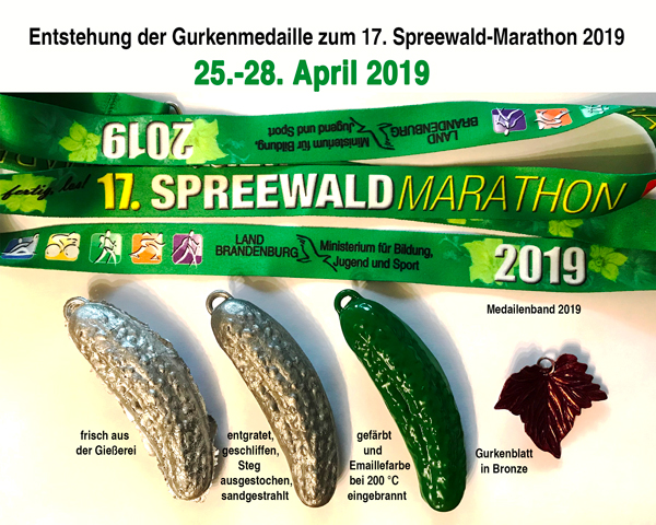 Wir haben uns vor 17 Jahren die Gurke als Medaille ausgesucht. Zum einem, weil der Spreewald eines der größten Gurkenanbau Gebiete in Deutschland ist und weil wir mit der Gurke als Medaille die einheimische Gurkenindustrie mit unserer Werbemaßnahme unterstützen wollten.