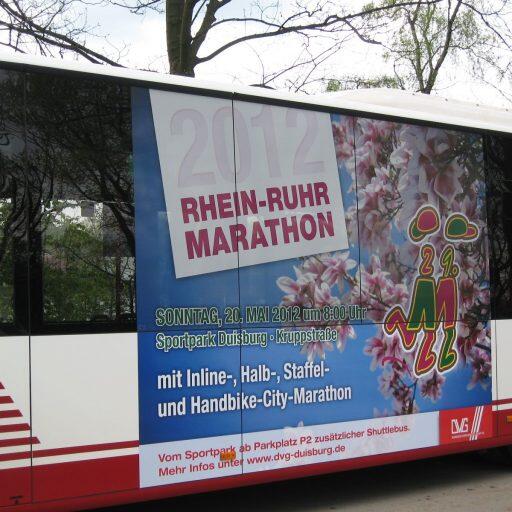 Werbung in Bus und Bahn sowie grüne Markierung für die Strecke – Stadtwerke Duisburg und DVG bringen Rhein-Ruhr-Marathon auf Linie