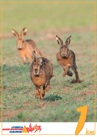 Statt nüchterner Zahlen erwarten die Läufer/innen auf den Kilometerschildern erstmals „tierische" Einblicke in die vielfältige Fauna der Fächerstadt. Die eindrucksvollen Bilder von "wilden Tieren" in der Region stammen von den Karlsruher Fotografen Norbert Daubner und Gaby Hufler.
