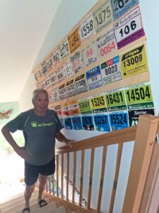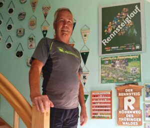 Volker Görlach zu Hause vor seiner Rennsteiglaufdevotionalien-Sammlung im Treppenhaus. – Foto: Siegrid Görlach