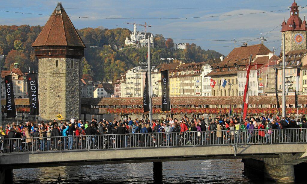 LUZERN, 30OKT11 - Impression von der Seebruecke, welche von den Laeuferinnen und Laeufern des 5. Lucerne Marathon mehrmals ueberquert wird, im Hintergrund die Luzerner Altstadt. Impression of the 5th Lucerne Marathon on Sunday, October 30, 2011 in Lucerne, Switzerland. swiss-image.ch/Photo by Andy Mettler
