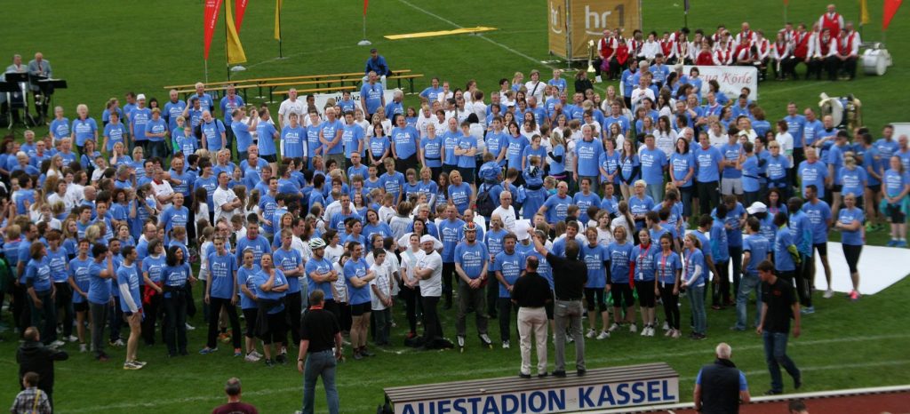 In Blau und Weiß wurde mit vielen Läufern, darunter in der Mehrzahl die Schüler des Engelsburg-Gymnasiums, das alte Kasseler Wappen auf dem Rasen dargestellt. Eine sicher einmalige Aktion. Die Musik- und Spielmannszüge FT Niederzwehren, TSV 91 Oberzwehren, Blasorchester Wellerode Blasorchester Brunslar, MZ Körle und MZ Simmershausen sorgten für den musikalischen Rahmen des von Marathon-Veranstalter Winfried Aufenanger moderierten und von ihm und Norbert Schäfer organisierten Auftakts.