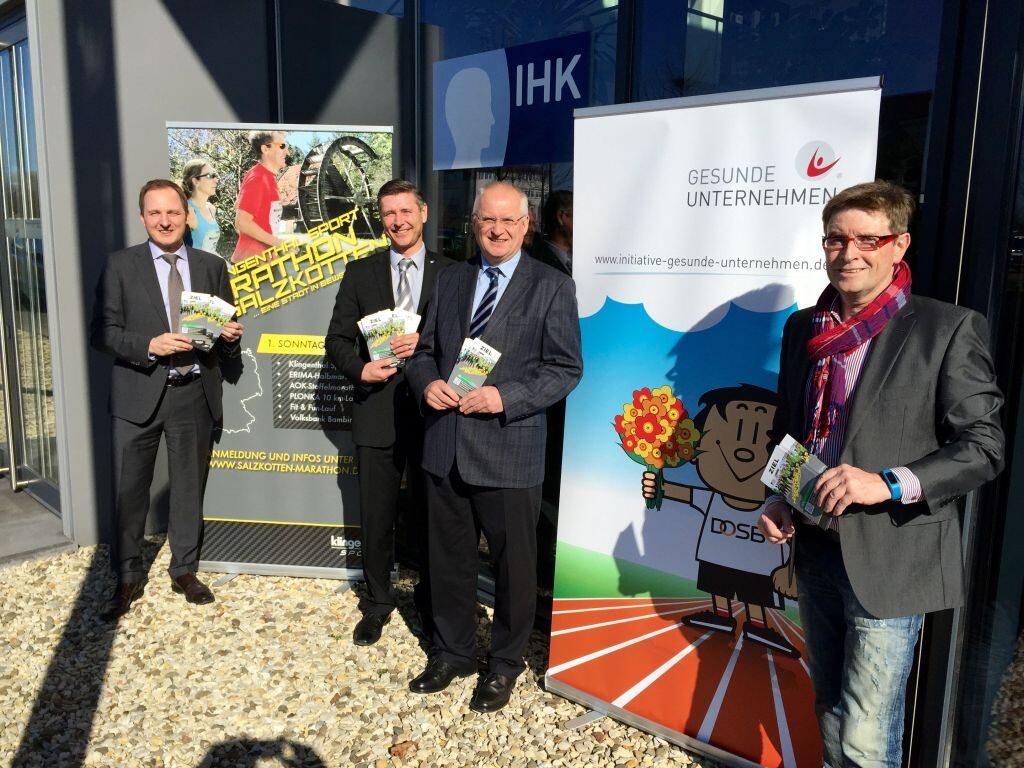 (v.lks.): Sascha Wiczynski (Orga-Leiter des Klingenthal Sport Marathons), Jürgen Behlke (IHK, Leiter der Zweigstelle Paderborn + Höxter), Heinrich Bade (AOK Paderborn, Namensgeber des Staffelmarathons) und Hans-Joachim Meier (Teamleiter praenet / Organisation Klingenthal Sport Marathon) freuen sich auf möglichst Auszubildende sowie Teilnehmerinnen und Teilnehmer