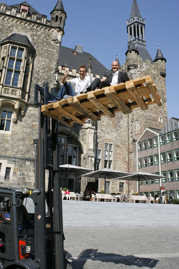 Schon beim Aufbau ging es in luftige Höhen: Björn Otto (li.) und NetAachen-Geschäfts-führer Andreas Schneider auf einer der 350 Europaletten, die unter der Sprungmatte liegen. ©NetAachen-Domspringen