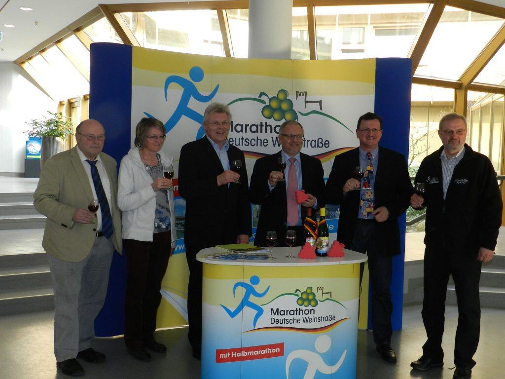 Sie präsentierten den 9. Marathon Deutsche Weinstraße im Kreishaus (v.l.): Bockenheims Ortsbürgermeister Kurt Janson, Dr. Ute Turznik (TSG Grünstadt, sportliche Leiterin), Bürgermeister Reinhold Niederhöfer (VG Grünstadt-Land), Landrat Hans-Ulrich Ihlenfeld und Organisationsleiter Rolf Kley (Kreisverwaltung Bad Dürkheim) sowie Klaus Mattern (TSV Bockenheim, wirtschaftlicher Leiter) ©Marathon Deutsche Weinstraße