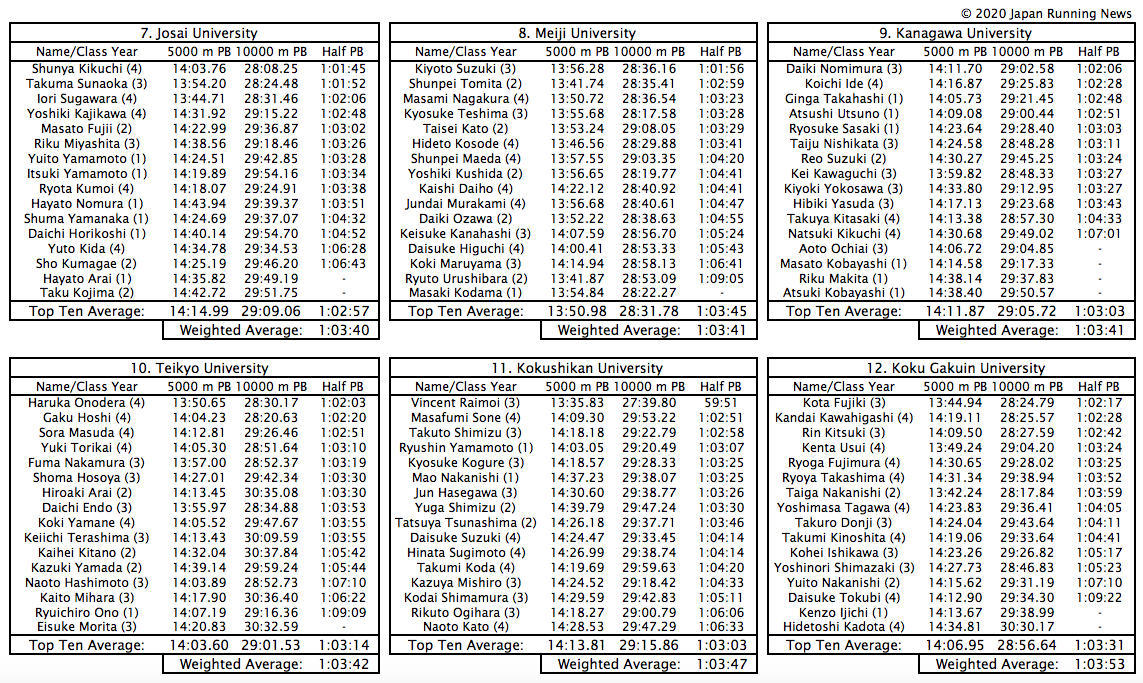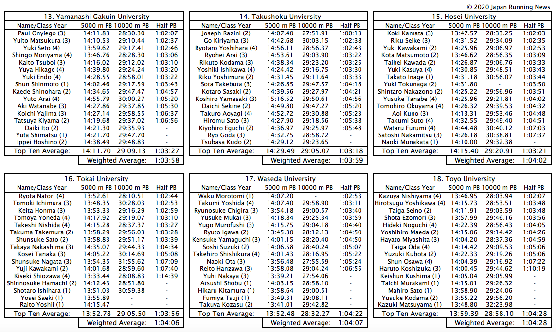 Das Ergebnis sind einerseits solide Teams aus der Yosenkai-Qualifikation wie die Chuo Universität und die Juntendo Universität, deren Star im ersten Jahr, Ryuji Miura, den nationalen Halbmarathon-Juniorenrekord von Suguru Osako mit einer 1:01:41 bei der Qualifikation brach und deren zehnter Mann dort 1: 02:40, und auf die anderen gesetzten Teams wie die Komazawa University, die Meiji University, die Waseda University und die Toyo University, die Top-Ten-Durchschnittszeiten über 5000 m und 10000 m unter 14 Minuten bzw. 29 Minuten haben, ohne dass die Halbmarathon-Zahlen dazu passen.