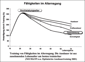 Vor allem Letztere müssen wissen, dass individuelle Grenzen den Abfall der Laufleistungsfähigkeit beeinflussen, dass bei Vielen erst ab dem 45.-50. Lebensjahr auf Grund hormoneller Umstellungen (biologisch gegebener Testosteronabfall beim Mann), auf Grund individuell unterschiedlicher Belastbarkeit, der Lebenssituation, möglicher Gewichtszunahmen, verlängerter Regenerationszeiten, der beruflichen Belastung, aber auch vom Lauftalent her die absolute Leistungsfähigkeit trotz Training (siehe auch Entwicklung der Altersrekorde) zunehmend abnimmt.