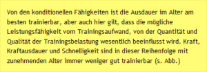 Gesundheit vorausgesetzt sind Sportler auch jenseits des 50. Lebensjahres noch gut trainierbar, wenn sie sich die Zeit dafür nehmen. Das gilt auch für die Kraftfähigkeiten. Mit fehlender spezieller Kraft lässt die Lauftechnik und damit auch die Laufökonomie nach. Auch mit einem höheren Umfang im aeroben Dauerlauf-Bereich ist nachlassende Geschwindigkeit im Verhältnis zur „Leistungszielgeschwindigkeit“ nicht kompensierbar.