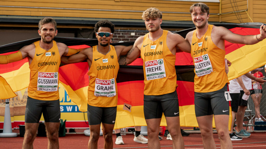 Kurz nachdem die DLV-Sprinterinnen bei der U23-EM über Bronze jubeln durften, zogen die Kollegen nach: Über 4×100 Meter sprinteten Benedikt Wallstein, Jan Eric Frehe, Maurice Grahl und Heiko Gussmann am Sonntag in Bergen zu Silber.