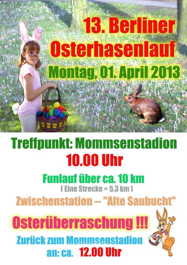 In Paderborn gibt es den schon 67-jährigen Paderborner Osterlauf im Halbmarathon und 10 km mit über 9.000 Teilnehmern, in Berlin gibt es eine nicht so lange Tradition mit Bernd Hübners 13. Berliner Osterhasenlauf, am Montag, dem 1. April 2013 um 10.00 Uhr am Mommsenstadion in Berlin Charlottenburg.
