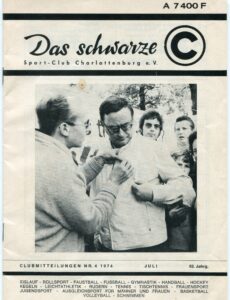 Der Regierende Bürgermeister Klaus Schütz (r.) beim 4. Berliner Volkswandern 1974 des SCC. Nach durchwanderten 25 km „Rund um dei Grunewaldseen“  Hundekehle, Grunewaldsee, Krumme Lanke und Schlachtensee (vom Mommsenstadion aus) erhält er die Erinnerungsmedaille vom Vorsitzenden der Leichtathletikabeilung des SCC Horst Milde.