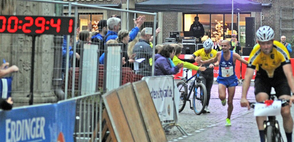 „Ich bin zu Hause“, sagte Pfeiffer noch vor dem Start und im Ziel war er schon kurz nach dem Einlauf zum Interview bereit. „Es ging richtig gut. Die Radfahrer haben einen riesen Job gemacht. Ich hab’s echt genossen, die Stimmung in Bocholt ist einfach unglaublich. Du wirst getragen von der Super Stimmung. So etwas habe ich deutschlandweit noch nicht erlebt“, war Pfeiffer voll des Lobes. In den ersten beiden Runden habe er Zeit rausgeholt, um in den Runden drei und vier, wenn es auf der Strecke voller werde, nicht so viel Zeit einzubüßen. Den Halbmarathon am 2. September hat er im Blick, „wenn es passt, und da werden wir nach der EM mal schauen, bin ich sicher dabei“, so Pfeiffer. Simon Dahl, der als Zweiter in 32:58 ins Ziel kam, war zum ersten Mal in Bocholt. „Ich komme wegen der Stimmung nach Bocholt und es war klasse“, so der Läufer vom Kölner Laufladen. Dritter wurde Youssef Wardi, der zuvor schon den 5er bestritten hatte. „Ich wollte eigentlich „nur“ auslaufen, konnte dann aber das Tempo mitgehen und habe bis zum Ende durchgezogen. Er finishte in 33:30 Minuten.