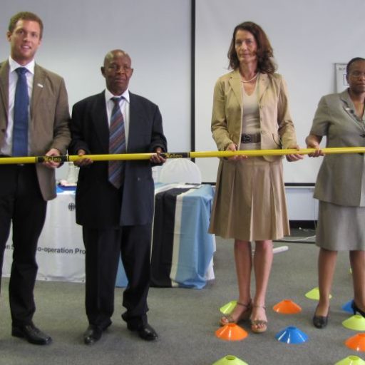 Zum Ende des Kurzzeitprojektes übergaben die deutsche Botschafterin Annett Günther und Projektleiter Scheer eine Sportgerätespende im Wert von 1400 Euro an den botswanischen Leichtathletikverband.