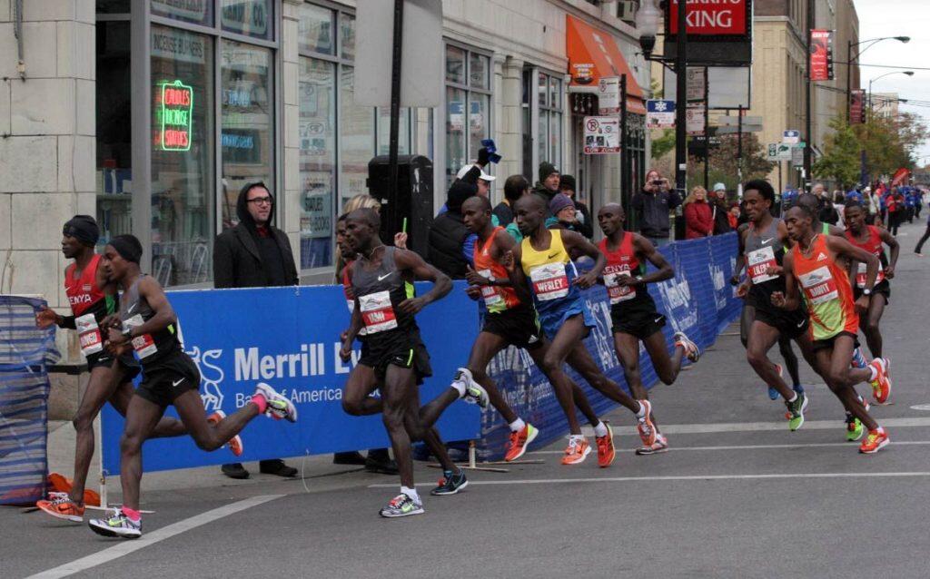 Die Spitze des Feldes beim Einbiegen in die Halstedt-Street kurz vor 27 km beim Chicago Marathon 2012. ©Collin Winter