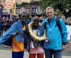Der Sieger Philemon Rono Cherop (m) mit dem traditionellen Siegeskranz, Kebede Tulu Wami (l) und race director Branislav Koniar auf dem linken Bild – auf dem rechten Foto die Siegerin Jackline Cherono – Fotos: Horst Milde