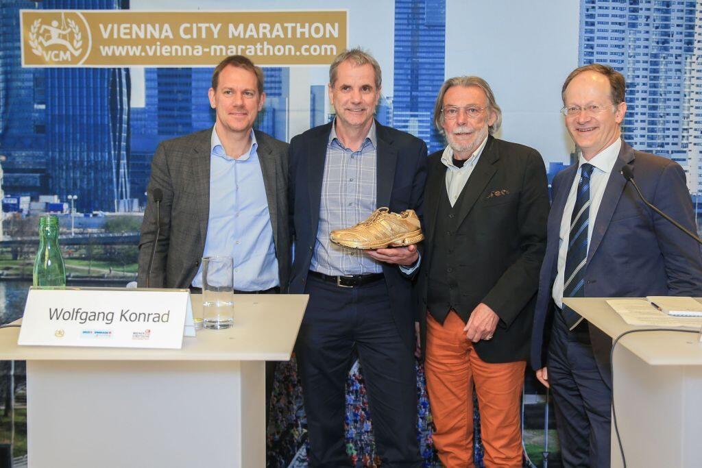 (v.l.): Mario Stadler, Marketingleiter Erste Bank; Wolfgang Konrad, VCM; Ernst Aichinger, Obmann des Sportartikelhandels in der Wirtschaftskammer Österreich; Hermann Fried, Landesdirektor Wien der Wiener Städtischen Versicherung. Ernst Aichinger überreichte an Wolfgang Konrad einen goldenen Laufschuh für die Impulswirkung des VCM auf den Fachhandel. © Erste Bank / Hinterramskogler