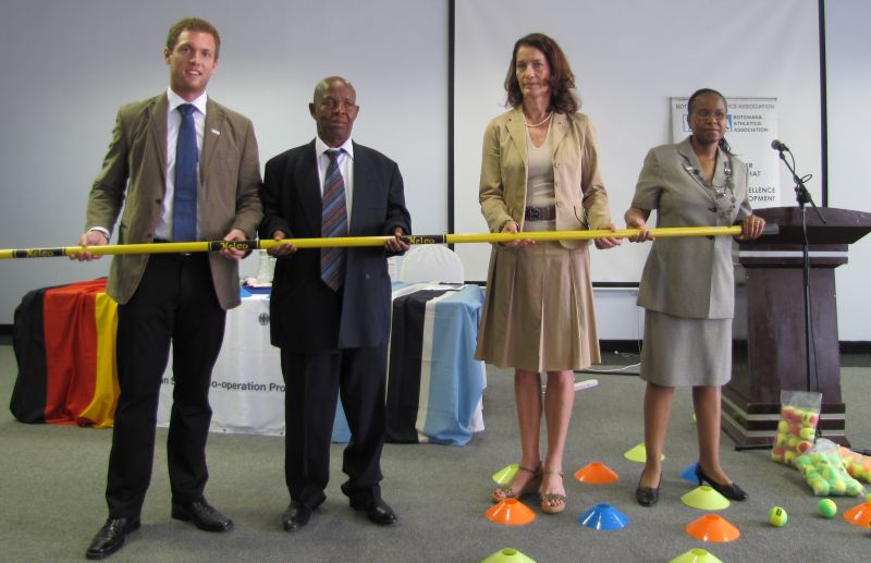 Zum Ende des Kurzzeitprojektes übergaben die deutsche Botschafterin Annett Günther und Projektleiter Scheer eine Sportgerätespende im Wert von 1400 Euro an den botswanischen Leichtathletikverband.