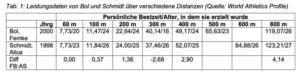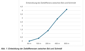 Interessant ist, dass sowohl Bol als auch Schmidt eine identische Zeit über die 60 m aufweisen. Beide scheinen damit über eine ähnliche Sprintfähigkeit zu verfügen. Dennoch haben sich die Leistungen auf den nachfolgenden Strecken sehr unterschiedlich entwickelt, wie die Tabelle 1 zeigt.