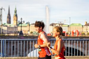 Beim BARMER Alsterlauf hat das einen Renncharakter irgendwo zwischen Straßenlauf und Stadionbahn – umständehalber, denn wegen der o.g. Baustelle gibt’s statt Binnenalsterrunden eine 1km-Pendelstrecke auf dem Ballindamm. Mehr scharfe Wendekurven für die Läuferinnen und Läufer, aber für die Zuschauende gibt‘s mehr zu sehen.