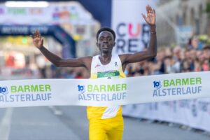 Sogar noch mit einer minimalen Chance auf einen Streckenrekord von 28:10… nein, doch nicht, es war doch zu knapp. Bis er durchs Zielband lief, war sonst niemand auf der Zielgeraden zu sehen. 28:29 zeigte die Zieluhr nach seinem Solo-Sprint. Erst da wurden seine beiden Verfolger sichtbar: Kifele Kefyalew (ETH) und Joseph Githakwa (KEN) kämpften um den zweiten Platz. Githakwa hing direkt hinter Kefyale, kam nicht an ihm vorbei… und nur eine Sekunde trennte die beiden im Ziel: 29:08 bzw. 29:09.