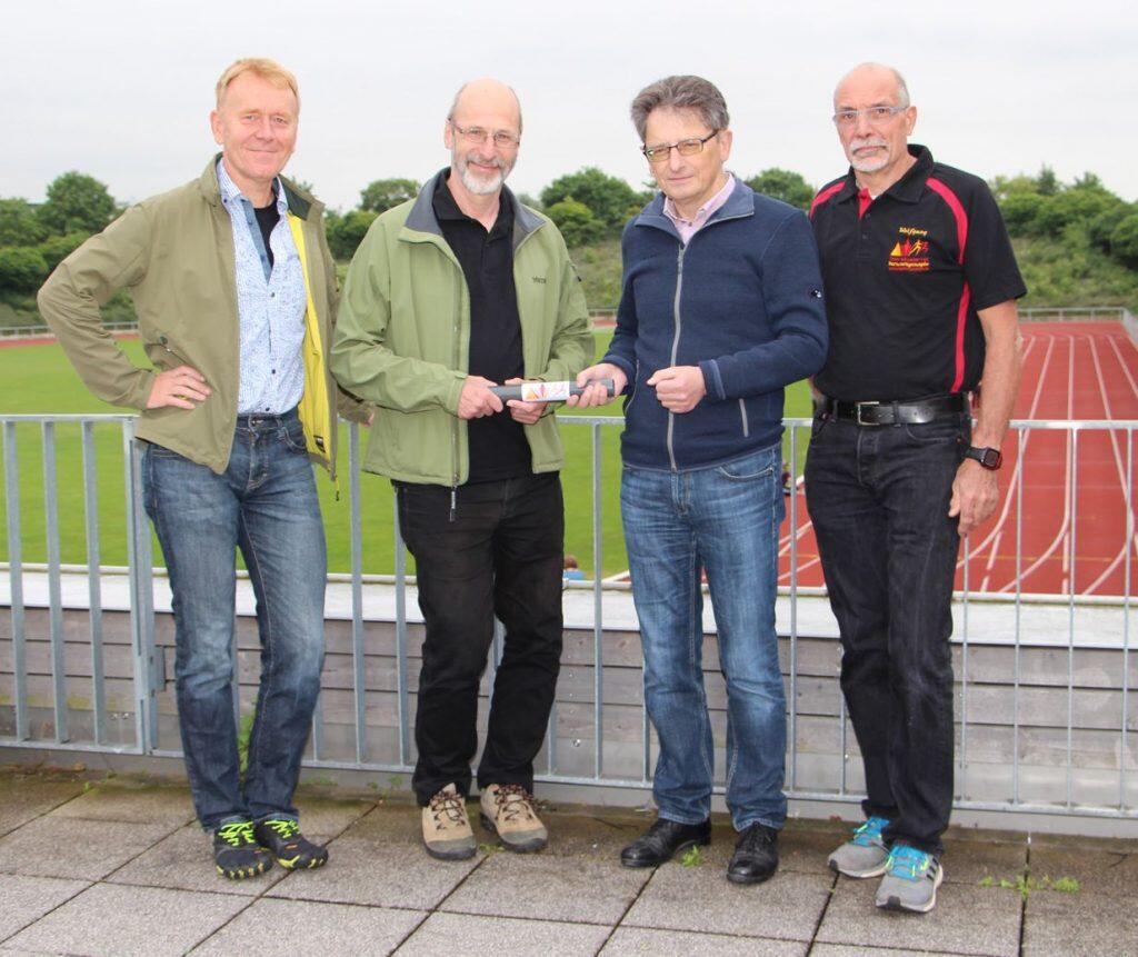Symbolische Staffelstabübergabe im Carl-Kaufmann-Stadion zeigt von links nach rechts: Fried-Jürgen Bachl (Geschäftsführer), Klaus Stapf (ehem. Vorsitzender und Bürgermeister), Norbert Wein (neuer Vorsitzender), Wolfgang Möck (stellv. Vorsitzender). Foto: Marathon Karlsruhe e.V.