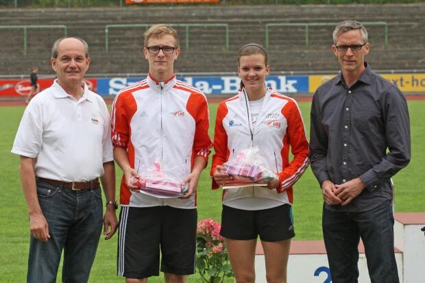 von links: Lutwin Jungmann (Meetingdirektor Rehlingen), Uli Mathis, Eileen Bischoff (beide LAZ Saarbrücken), Thomas Klein (1. Vorsitzender des LC Rehlingen) ©German Meetings