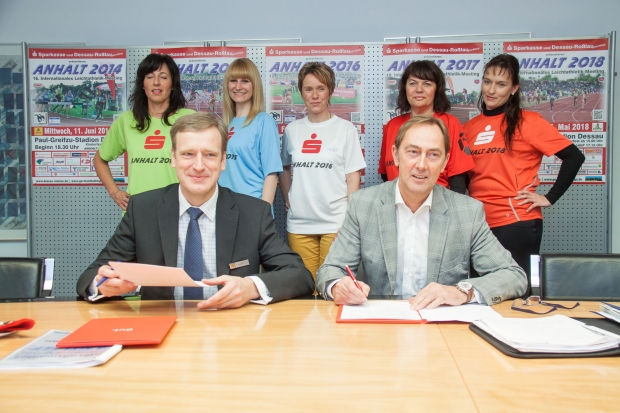 Und das nicht nur 2014. Etwas vorfristig – “die 15 bot als runde Zahl den perfekten Anlass”, so Ralph Hirsch augenzwinkernd – wurde der Vertrag mit einem der Hauptsponsoren, der Stadtsparkasse Dessau, um weitere fünf Jahre verlängert. Die Sparkasse, bei der Vertragsunterzeichnung durch Vorstandschef Konrad Dormeier vertreten, ist seit 1999, also von Beginn an dabei.