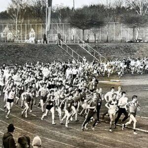 Paderborner Osterlauf – Mitte der 1970er Jahre – der „Pfuschlauf“ – Teilnehmer „schnippeln“ und laufen quer durch die Kurve – Foto: Peter Gehrmann