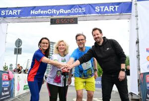 Der Charity-Lauf wird traditionell durch das Starterquartett eröffnet (v.l.n.r.): Karen Pein (Senatorin der Behörde für Stadtentwicklung und Wohnen), Sabine Tesche (Vorsitzende des Hamburger Abendblatt hilft e.V.) Dr. Andreas Kleinau (Vorsitzender der Geschäftsführung der HafenCity Hamburg GmbH), und Steven Richter (Geschäftsführer BMS Die Laufgesellschaft mbH) – Foto: Witters GmbH