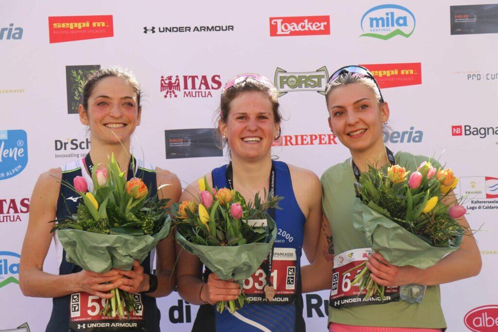 „Es war ein fantastisches Renne. In den letzten Monaten habe ich mich dem Ski-Langlauf gewidmet, jetzt musste ich mich schnell umgewöhnen: Bis gestern war ich noch auf dem Schnee unterwegs. Die Strecke war wunderschön und die Temperaturen perfekt“, erzählte Kuen nach ihrem Sieg. Etwas mehr als eine Minute nach ihr überquerte Sarah Giomi (CUS Pro Patria Milano) die Ziellinie, die 2019 noch den Under Armour Kalterer See Halbmarathon gewonnen hatte. Die Wahl-Boznerin hatte im Ziel 16 Sekunden Vorsprung vor der Drittplatzierten Martina Rizzoli (US Dolomitica ASD) aus dem Fleimstal.