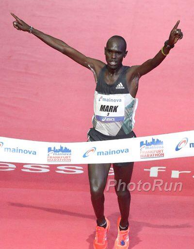 Mark Korir won a three-way Kenyan contest and took the 35th edition of the Mainova Frankfurt Marathon with a time of 2:06:48. The 28 year-old beat fellow Kenyans Martin Kosgey and Cybrian Kotut who ran 2:07:22 and 2:07:28 respectively. Bobby Curtis of the USA took a surprise fourth place, equalling