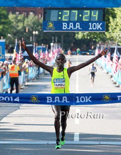 BOSTON - Records tumbled in bunches here at the fourth annual B.A.A. 10K, as both Stephen Sambu (KEN) and Mamitu Daska (ETH) successfully defended their event titles from 2013. Sambu, 25, raced his way to a world leading time of 27:25 and set