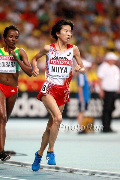 Prefigured precisely by her meet record 31:06.67 win at June's National Championships, where she took the lead just past 3000 m and ran alone right on national record pace to lap the entire field, and by the London Olympics where she led a significant portion of the race to make the top ten in a PB of 30:59.19, a performance that you would think should have earned her enough respect to be called by her name rather than just "Japanese girl" by at least one prominent American outlet covering Moscow, Niiya took over from struggling American rabbit Shalane Flanagan after 3000 m and relentlessly pushed on at PB pace until she had ground the field down to just four competitors, two Ethiopian and two Kenyan.