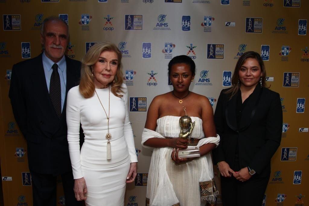 Dagmawit Amare, Strategic and Innovation Manager for the Great Ethiopian Run with the award. (left to right): Vassilis Sevastis, General Secretary of SEGAS, Marianna Vardinogianni, Goodwill Ambassador of UNESCO, Dagmawit Amare Strategic and Innovation Manager for the Great Ethiopian Run, Martha Morales, AIMS Vice President. ©ACM / Marathon Photo