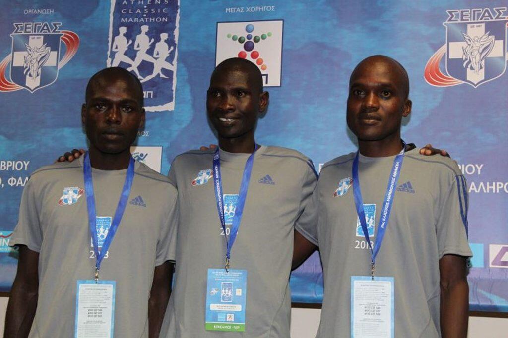 Kenyans Paul Kiprop, Raymond Bett and David Kisang (left to right) during a press conference in Athens. ©ACM / Marathon Photo