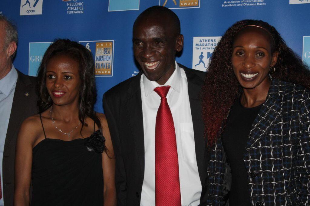 It’s been a highly successful last 12 months or so for Eliud Kipchoge with victory in three marathon classics of Chicago, London and Berlin. And 2015 became even better for the Kenyan without running a single step when he was awarded the men’s prize as Marathon Runner of the Year at the AIMS Gala in Athens on Friday evening.