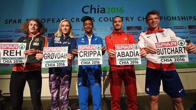 Some of the leading athletes Alina Reh (GER), Karoline Bjerkeli Grovdal (NOR), Yemaneberhan Crippa (ITA), Antonio Abadia (ESP) Andrew Butchart (GBR) competing in this year's SPAR European Cross Country Championships in Chia. ©EA - European Athletics