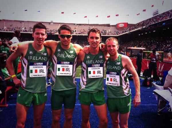 The Irish relay team finished in third place in the 2014 edition of the Penn Relays in Philadelphia, USA on Saturday, 26th of April. John Travers (Donore Harriers AC), Brian Gregan (Clonliffe Harriers AC), Paul Robinson (St Coca’s AC) and John Coghlan (MSB AC) combined to record a time of 9.42.83 for the Distance Medley Relay (DMR) event. The DMR is made up of four legs: 1,200m, 400m, 800m and 1 mile.