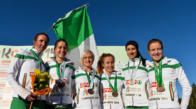 14 December 2014; The Ireland's women's team, from left to right, Siobhan O'Doherty, Sara Treacy, Ann-Marie McGlynn, Michelle Finn, Laura Crowe and Fionnuala Britton, after finishing in 3rd place in the team event in the Women's race. Spar European Cross Country Championships, Samokov, Bulgaria. Picture credit: Ramsey Cardy / SPORTSFILE