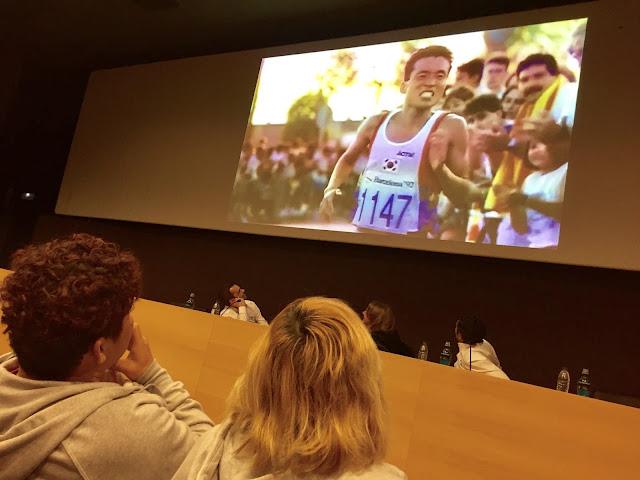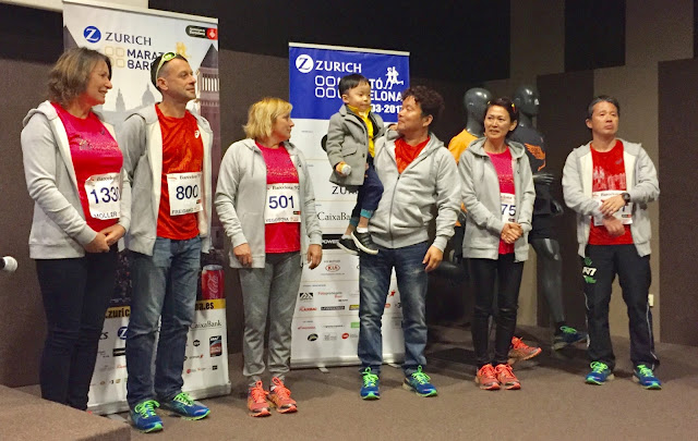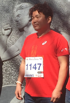 The six medalists reunited, Hwang with son Yuchan. All six will run Saturday's Breakfast Run over the final 4 km of the 1992 Barcelona Olympics marathon course, the climb up Monjuic. Freigang is the only one of the six who will also run Sunday's Zurich Barcelona Marathon.