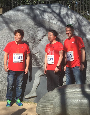 Gold medalist Hwang, silver medalist Morishita and bronze medalist Freigang at the Hwang monument in front of the Olympic Stadium.