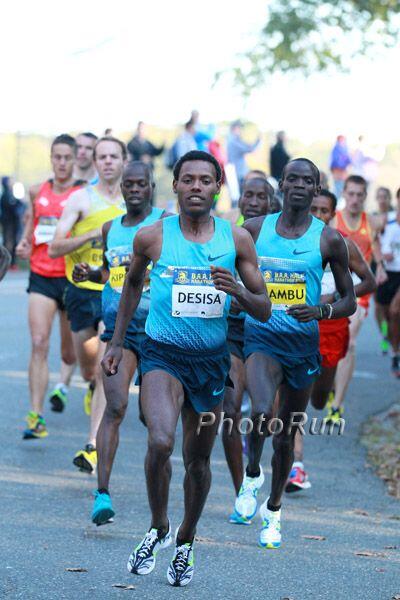 By the eight-mile mark, the lead pack was narrowed to Sambu, Salel, Kiprono, Desisa, and Sam Chelanga (KEN). Following a 4:22 mile split in the ninth mile, Salel and Sambu took the lead and raced side-by-side.