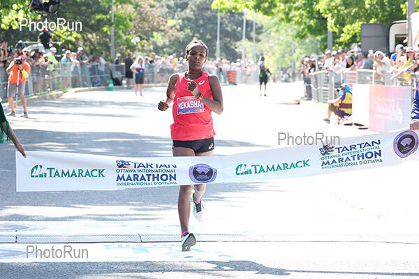 Ethiopia’s Waganesh Mekasha was the fastest woman at today’s Tartan Ottawa International Marathon—running alone for most of the second half of the race—finishing in 2:24:47. Canada’s Malindi Elmore overtook Germany’s Melat Kejata in the home stretch to capture 2nd place, with a time of 2:27:44. Kejata finished 3rd in 2:27:50.