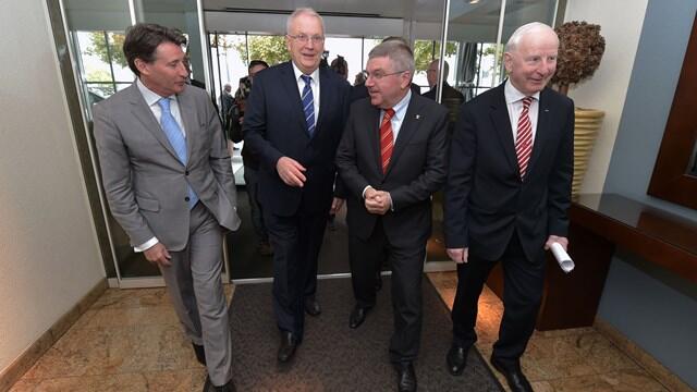 President Hansen with IOC President Thomas Bach, IAAF President Sebastian Coe and EOC President Patrick Hickey in Lausanne, Switzerland, on Friday. ©European Athletics - EA