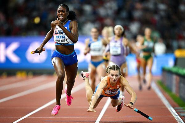 Alexis Holmes of USA, left, on her way to winning the mixed 4x400m as Femke Bol of Netherlands falls at the World Athletics Championships Budapest 23 - Foto: © Sam Barnes / Sportsfile/World Athletics