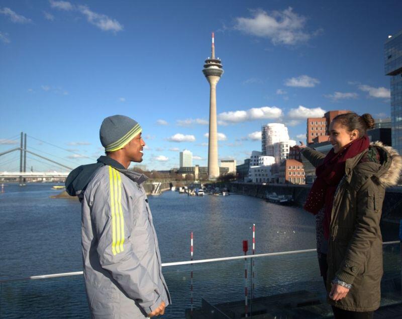 Castle Tower, Media Harbour, Athletics Hall at Arena Sportpark, Tulip Inn Duesseldorf Arena. Local sprinter Jessie Maduka from the “Stockheim Team Rio” showed the 35-year-old Olympic and World relay champion Chris Brown of the Bahamas through the sports city of Duesseldorf.