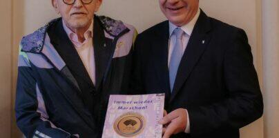 Horst Milde, the founder and long-time race director of the Berlin Marathon, handed over the book for the 50th anniversary of the race, which took place last Sunday, to Berlin’s governing mayor Kai Wegner at the Berlin City Hall today.